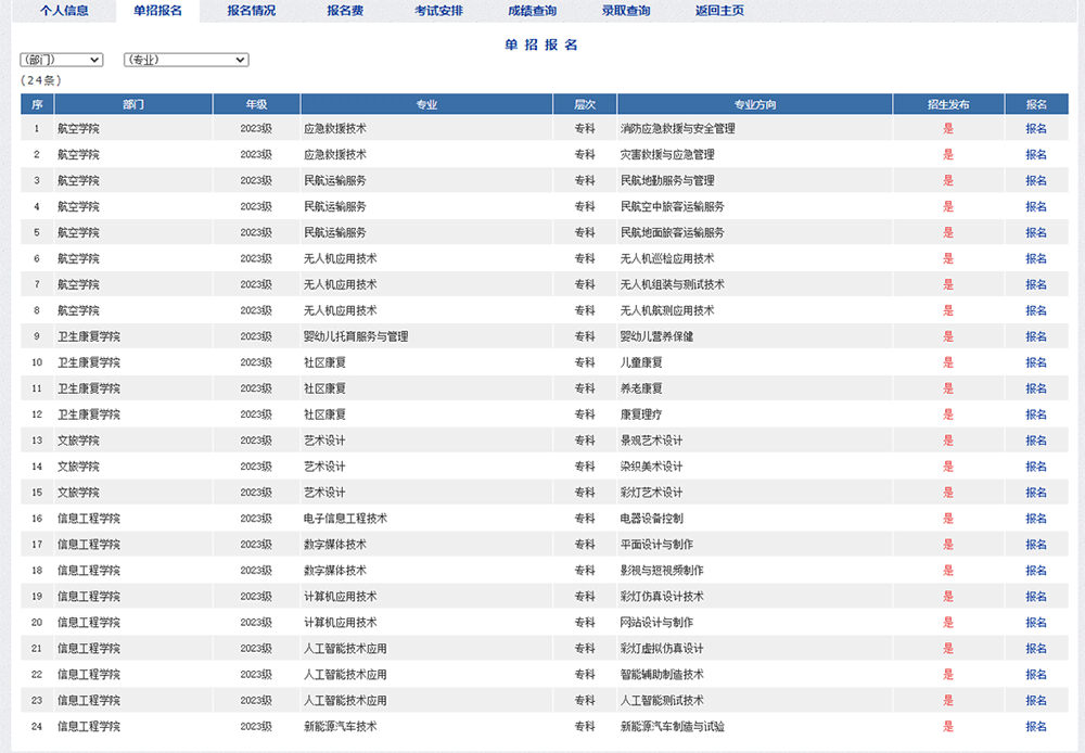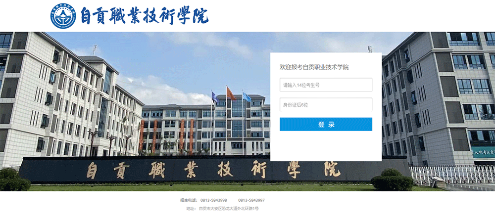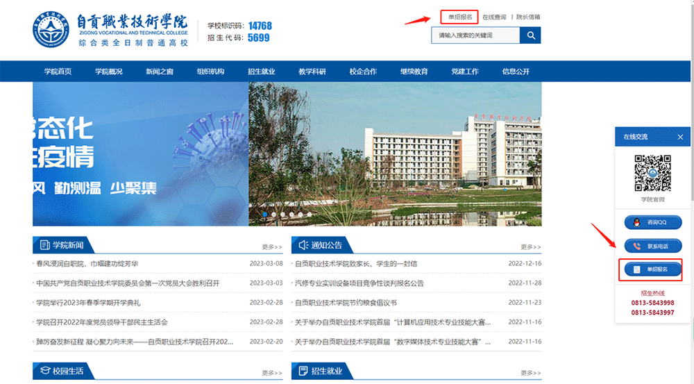 打开浏览器,输入网址(https://www.zgzyjsxy.com/)进入自贡职业技术学院官网,点击单招报名进入2023年单独招生报名系统。